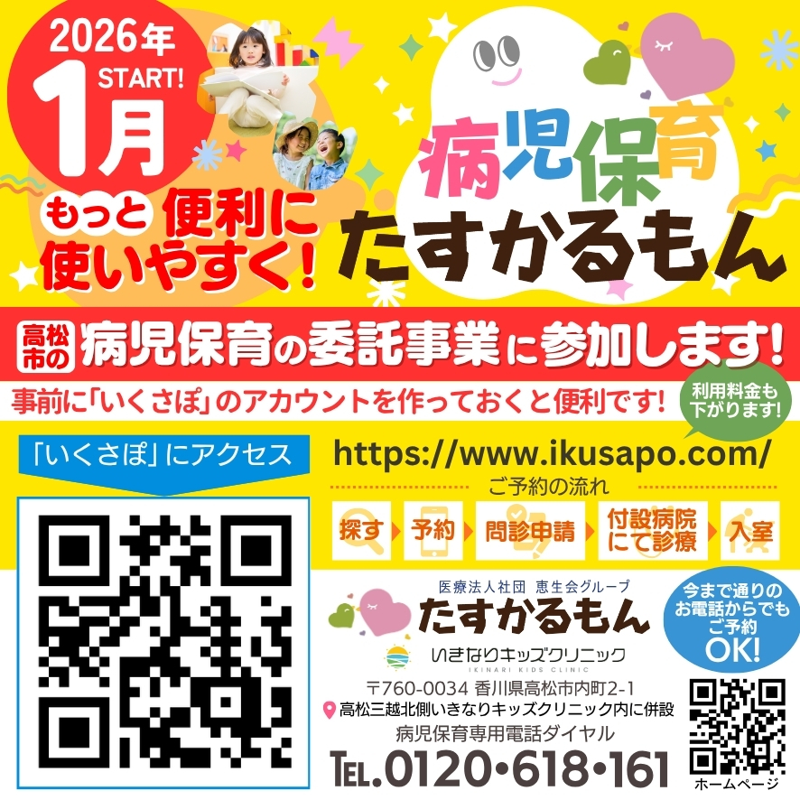 🎉2026年1月より、”病児保育室たすかるもん”が、高松市子育て支援課の委託により運営できることになりました!!
